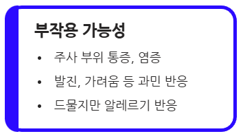 드물게 주사 부위에 통증이나 염증이 생길 수 있고, 발진이나 가려움 같은 과민 반응이 나타날 수도 있어요.