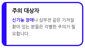 특히 신기능 장애나 심부전 같은 기저질환이 있는 분들은 투여에 각별한 주의가 필요합니다.