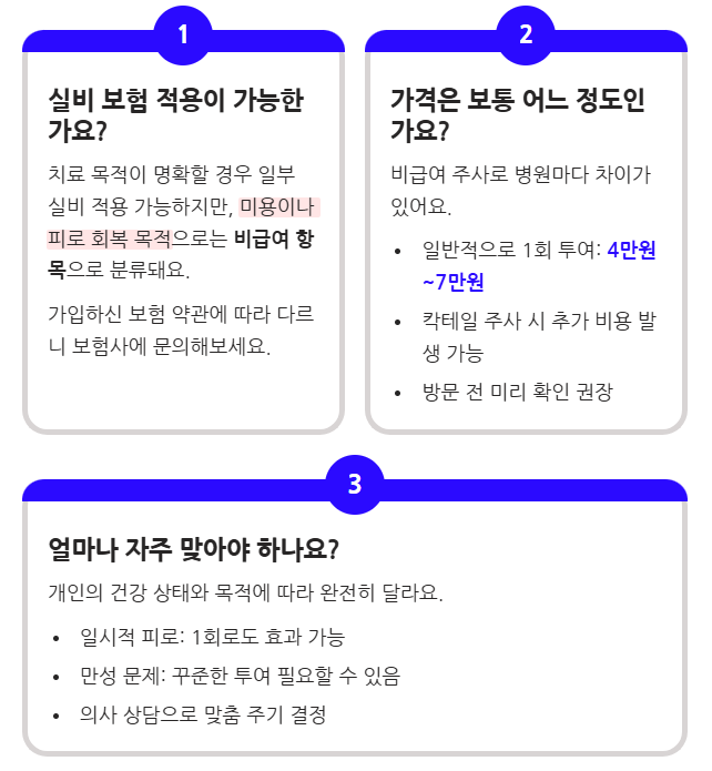 그래서 단순 비타민 주사와는 근본적으로 목적이 조금 다르다고 할 수 있죠.