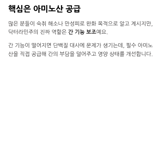 간 기능이 저하되면 단백질 대사에 문제가 생기는데, 닥터라민주는 분지쇄아미노산(BCAA) 같은 필수 아미노산을 직접 공급해서 간의 부담을 덜어주고, 전반적인 영양 상태를 개선하는 데 도움을 줄 수 있습니다.