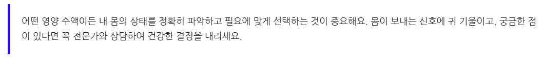 어떤 영양 수액이든 내 몸의 상태를 정확히 파악하고 필요에 맞게 선택하는 것이 중요하답니다.
