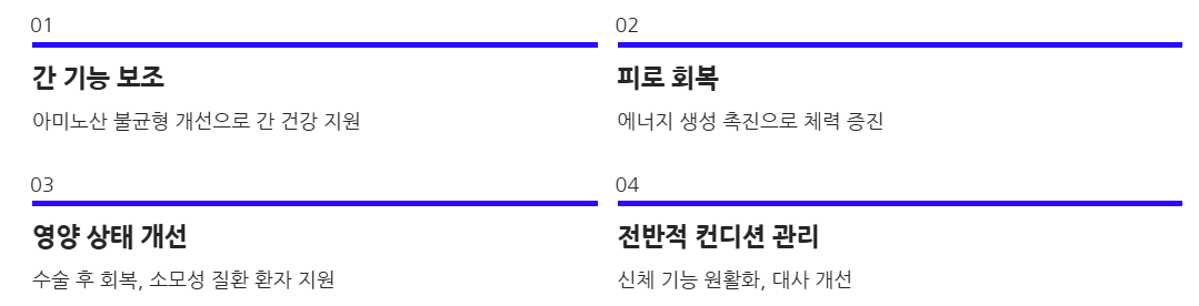 주된 목적인 간 기능 보조 외에도, 아미노산이 체내 에너지 생성에 직접 관여하기 때문에 피로 회복과 체력 증진에도 긍정적인 영향을 줄 수 있어요.