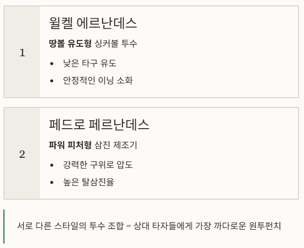 이렇게 서로 다른 스타일의 투수들이 원투펀치를 이룬다면 상대 팀 타자들에게는 정말 까다로운 조합이 될 수밖에 없어요.