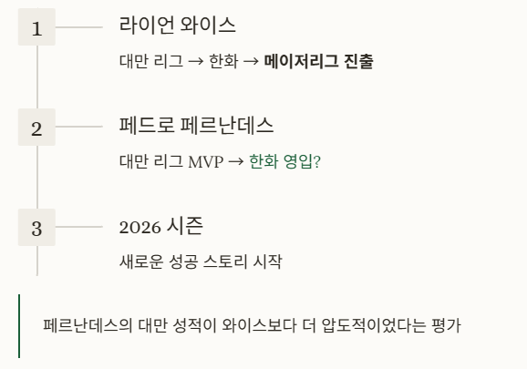 오히려 페르난데스의 대만 리그 성적이 와이스보다 더 압도적이었다는 평가도 있어서 기대감이 더욱 커지는 것 같아요.
