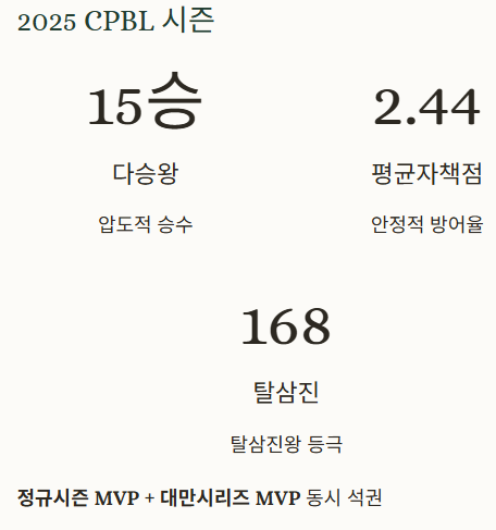 그의 2025시즌 대만 프로야구(CPBL) 성적을 보면 입이 떡 벌어질 정도랍니다.