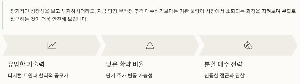 그래서 장기적인 성장성을 보고 투자하시더라도, 지금 당장 무작정 추격 매수하기보다는 기관 물량이 시장에서 소화되는 과정을 지켜보며 분할로 접근하는 것이 더욱 안전해 보여요.