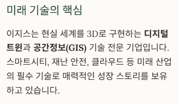 이지스는 현실 세계를 3D로 똑같이 구현하는 디지털 트윈과 공간정보(GIS) 기술을 가진 전문 기업이에요.