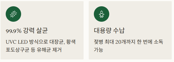 넉넉한 용량으로 젖병 20개는 물론 다양한 육아용품까지 한 번에 살균 건조하고 멸균 보관할 수 있다는 점, UVC LED 살균 방식으로 99.9% 강력한 살균력을 자랑한다는 점, 그리고 무엇보다 합리적인 가격으로 만날 수 있다는 점이 큰 매력으로 다가왔을 거예요.