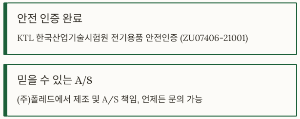 (주)폴레드에서 제조하고 A/S까지 책임지고 있으니, 혹시라도 문제가 생기면 언제든 문의할 수 있다는 점도 안심이 됩니다.