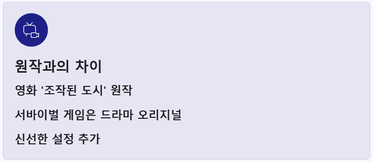 A: 조각도시의 원작은 영화 '조작된 도시'인데요, 주인공이 누명을 쓴다는 기본 설정은 같지만 5화에서 본격적으로 시작된 재소자들의 서바이벌 게임은 드라마에서 새롭게 추가된 오리지널 설정이에요.