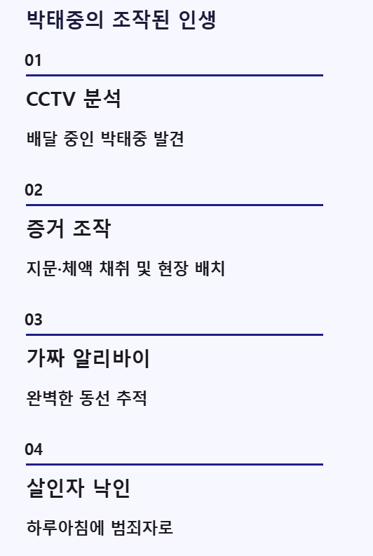 박태중의 모든 동선을 추적해 가짜 알리바이를 만들고, 집에 몰래 침입해 지문과 체액 같은 증거들을 채취해서 사건 현장에 완벽하게 남겨놓는 치밀함을 보여줬어요.